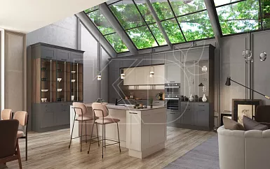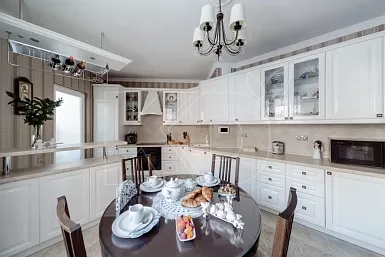 2. Размер. Мебель размещается в больших столовых и поэтому имеет большие размеры. Планировка - П-образная или квадратная, обычно с островом. Кухонные гарнитуры более сложные и часто имеют барную стойку или витражные шкафы. Дешевые модели обычно меньше по размеру и имеют линейную планировку.