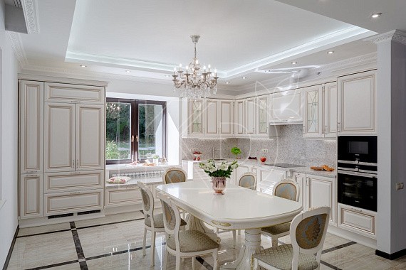 - Классика. Вечно актуальный вариант уместен и в частном доме. Он подойдет кухне с большими окнами и высокими потолками.