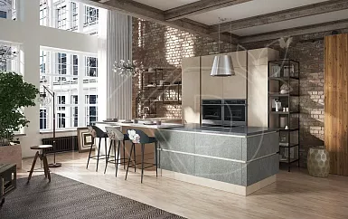 В просторных квартирах-студиях и отдельных помещениях площадью от 12 квадратных метров часто используют островные комплекты. Модули при такой планировке устанавливают вдоль одной или двух стен, в виде буквы П. Дополнительные навесные полки и шкафы часто размещают у окна.