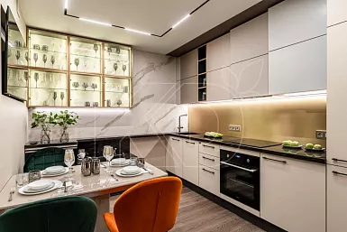 Дорого и привлекательно смотрится также бежевая кухонная мебель. Как правило, такие гарнитуры рекомендуют для комнат компактных размеров, потому что они не затеняют пространство. Считается, что на большой площади, особенно с хорошим дневным светом, беж может затеряться и выглядеть не столь эффектно. На самом деле подобрать подходящий оттенок можно и для просторного помещения. В таких случаях дизайнеры рекомендуют обратить внимание на бежевый с зеленым, коричневым, лиловым или серым подтоном.