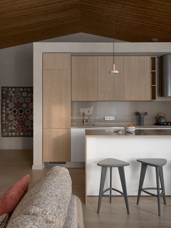 Интерьер не спорит с пейзажем за панорамными окнами, а становится его эхом. Когда за стеклом замирает лес, кухня превращается в мягкую раму для этой живой картины. Цветовая палитра — это диалог рассветных сумерек и пробуждающейся природы: молочные фасады, словно легкая дымка, растворяются в теплых фактурах светлого дерева.