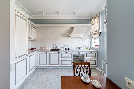 Современная классическая кухня, выполненная в голубых, серых, молочных и черных оттенках, смотрится невероятно стильно и элегантно.