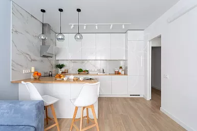 Самый эстетичный материал – натуральный камень, например, гранит или мрамор. Он очень красив, благородно смотрится и служит десятками лет. Поэтому купить кухню со столешницей из камня будет хорошим решением. Однако нужно учитывать, что такой материал хрупок и может образовывать сколы при сильных ударах. Искусственный камень такими минусами не обладает. По внешнему виду он ничем не отличается от натурального, но гораздо более долговечен и устойчив к механическим повреждениям и агрессивным чистящим средствам.