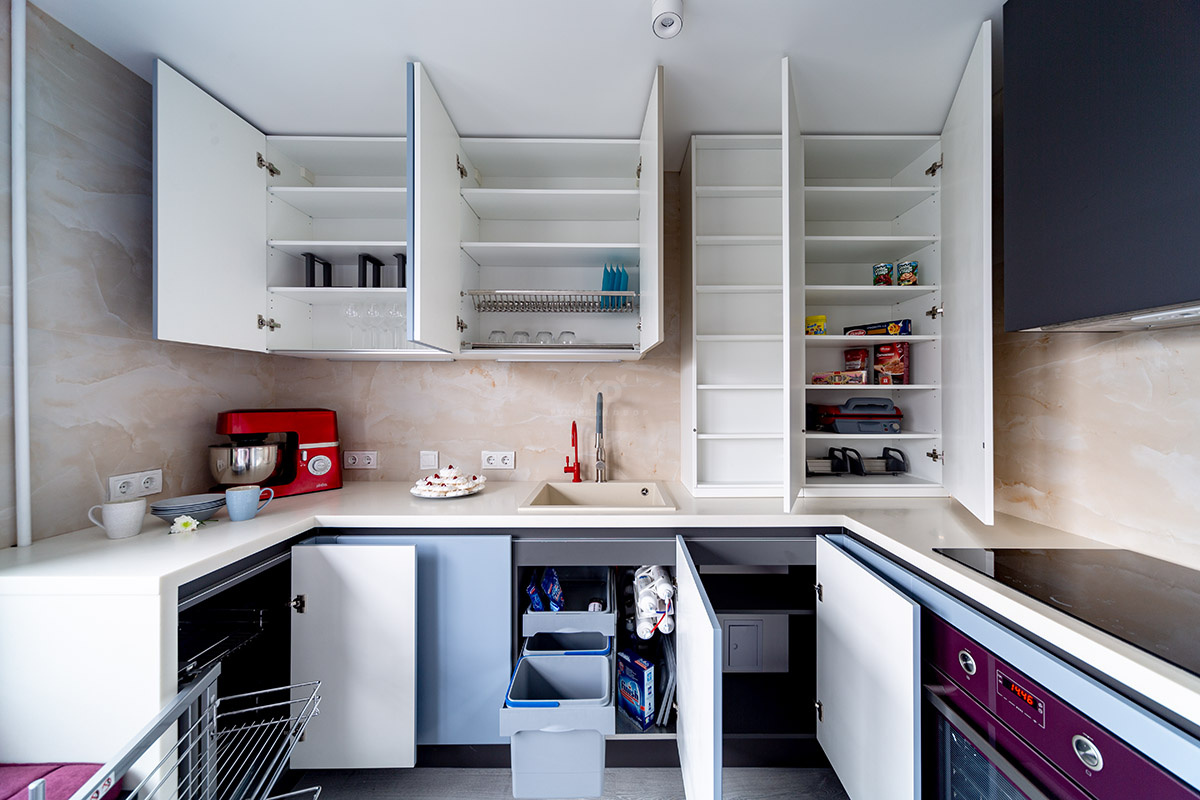 В зависимости от типа фасадов, для их открывания используются две системы – «Tip-On» и «Space Line». Первая отлично подходит для фасадов верхнего яруса и не нарушает их монолитность. А вторая подчёркивает контуры кухни и создаёт иллюзию «парящей» столешницы. Кстати, рабочая поверхность и корпус выполнены в одном цвете, поэтому кажется, будто столешница «ниспадает» на пол. Выглядит очень эффектно, особенно в сочетании со «Space Line» и графитовыми цоколями!