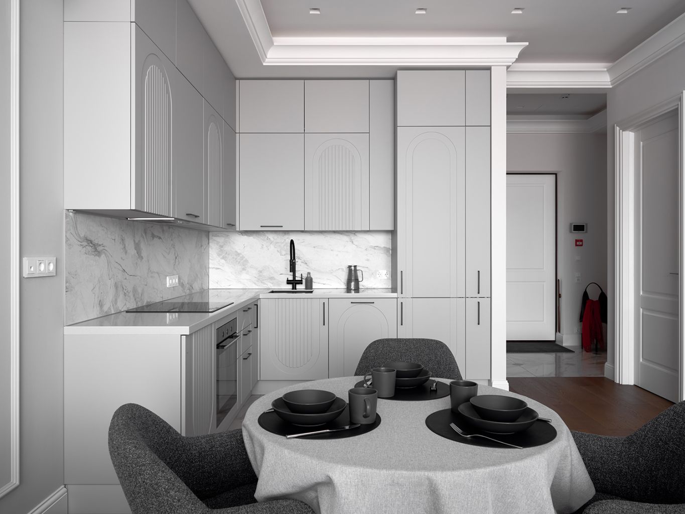 Работа над проектом началась с уже готового пространства. Чистовой ремонт от застройщика задал четкий вектор: серые стены, украшенные неоклассическими молдингами, каменные подоконники и заранее подготовленная плитка в мокрой зоне диктовали геометрию. Единственно верным решением была большая угловая кухня в неоклассическом стиле, которая логично бы продолжила архитектурную мысль интерьера.
