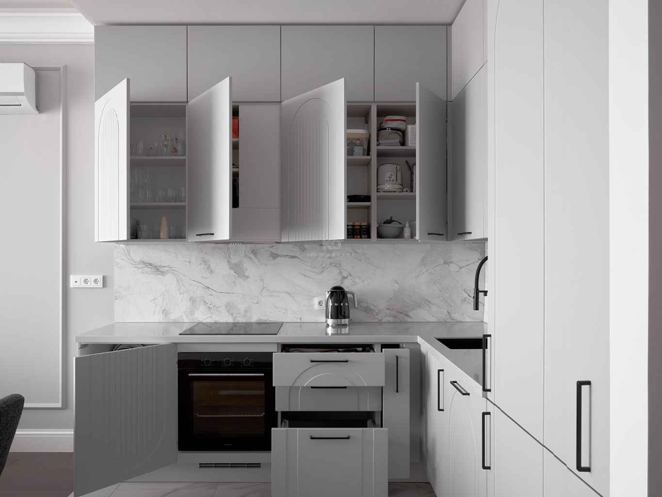 Выбранный благородный серый оттенок фасадов идеально вписался в цветовую палитру стен, создавая эффект монохромной элегантности. Чтобы интерьер не выглядел плоским, мы добавили выразительные акценты.