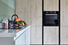 Поверхности не просто схожи, а связаны между собой чёрным цветом. На потолке в нём выполнены софиты, а на кухне – цоколь и профили системы «Space Line». Это та самая система открывания фасадов без ручек, которая делает поверхности гарнитура максимально объемными и выразительными! Кстати, тёмные элементы здесь присутствуют не только снаружи. Всё внутреннее пространство пенальной группы также выполнено в стильном чёрном цвете. Пеналы оснащены удобными аксессуарами для хранения продуктов и утвари, а также встроенным холодильником и духовым шкафом на удобной высоте.